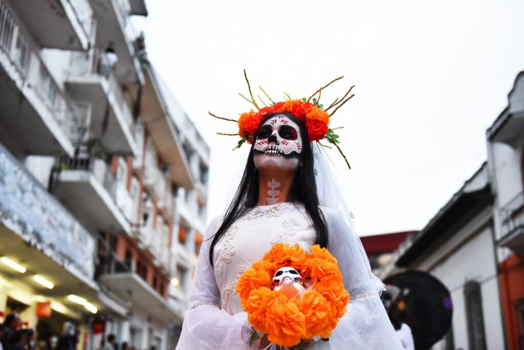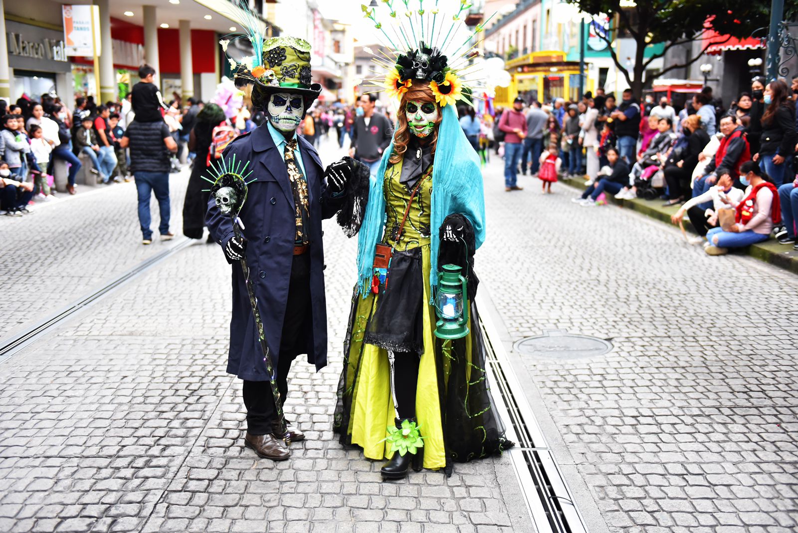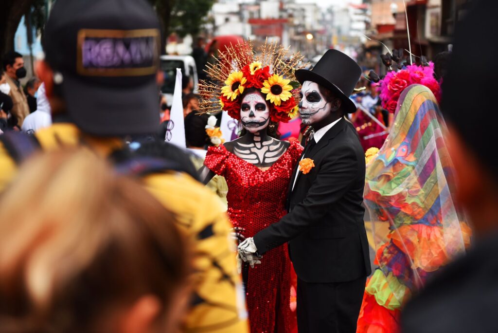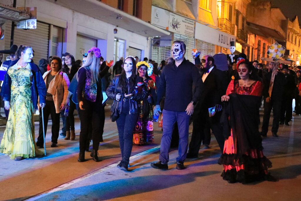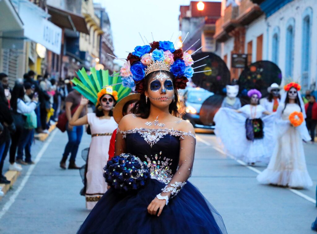 Xalapa, Ver.- Al ritmo de marching band y caracterizados como catrines y catrinas, cientos de xalapeñas y xalapeños salieron a la calles del primer cuadro de la ciudad para sumarse a la sexta edición del Paseo de Catrinas, organizado por la asociación Sumando Voluntades Xalapa.