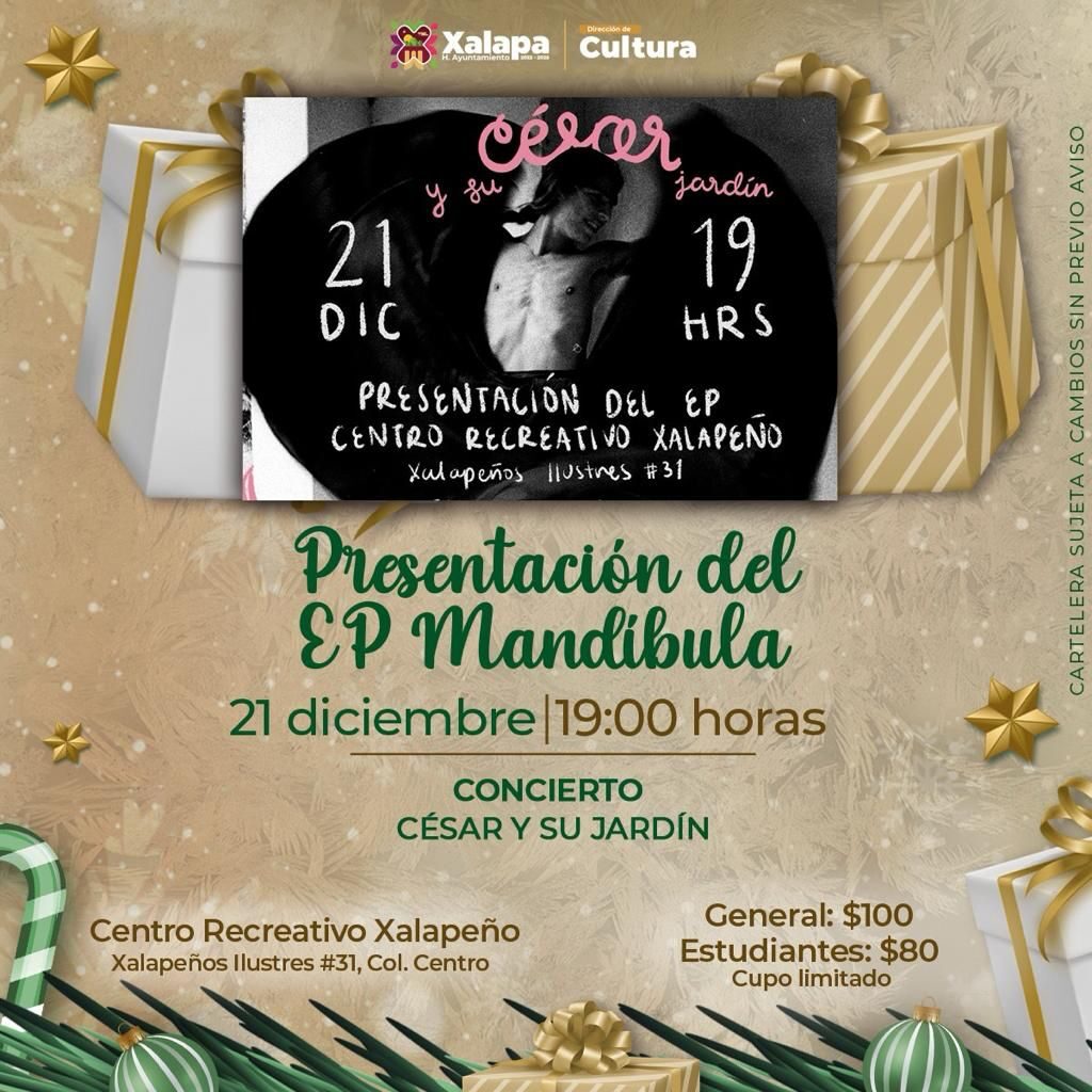 El jueves 21 de diciembre a las 19:00 horas en el Centro Recreativo Xalapeño, César y su Jardín presentarán su EP Mandíbula, y al mismo tiempo, se proyectará el largometraje “It must be heaven” (2019), como parte del Ciclo de Cine Palestino “Retrospectiva a Elia Suleiman”.
