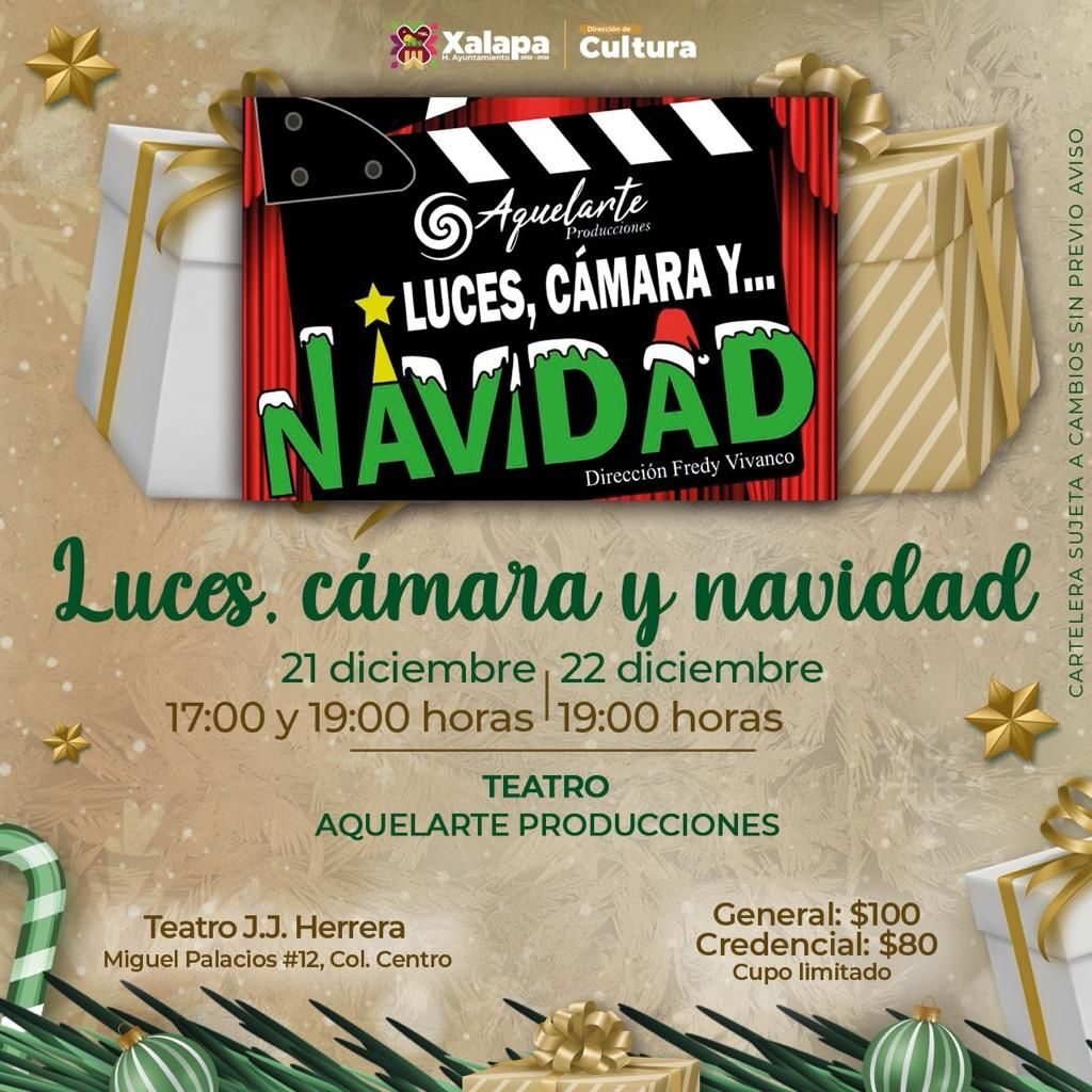 Xalapa, Ver.- Con el apoyo del Ayuntamiento de Xalapa, Aquelarte Producciones llega al Teatro J.J. Herrera con su performance: “Luces, cámara y Navidad”, este jueves 21 de diciembre con dos funciones: a las 17:00 y 19:00 horas, y el viernes 22 a las 19:00 horas.