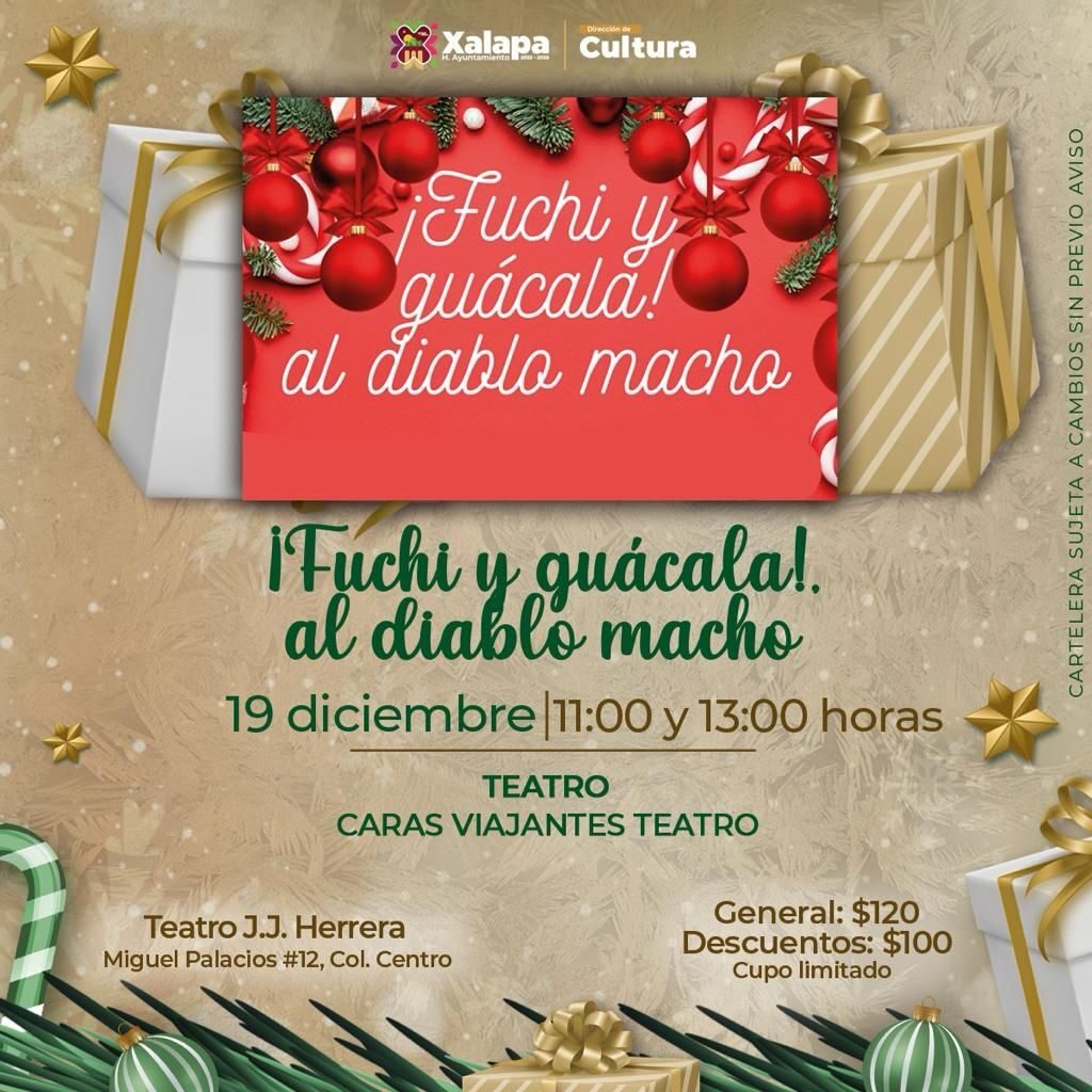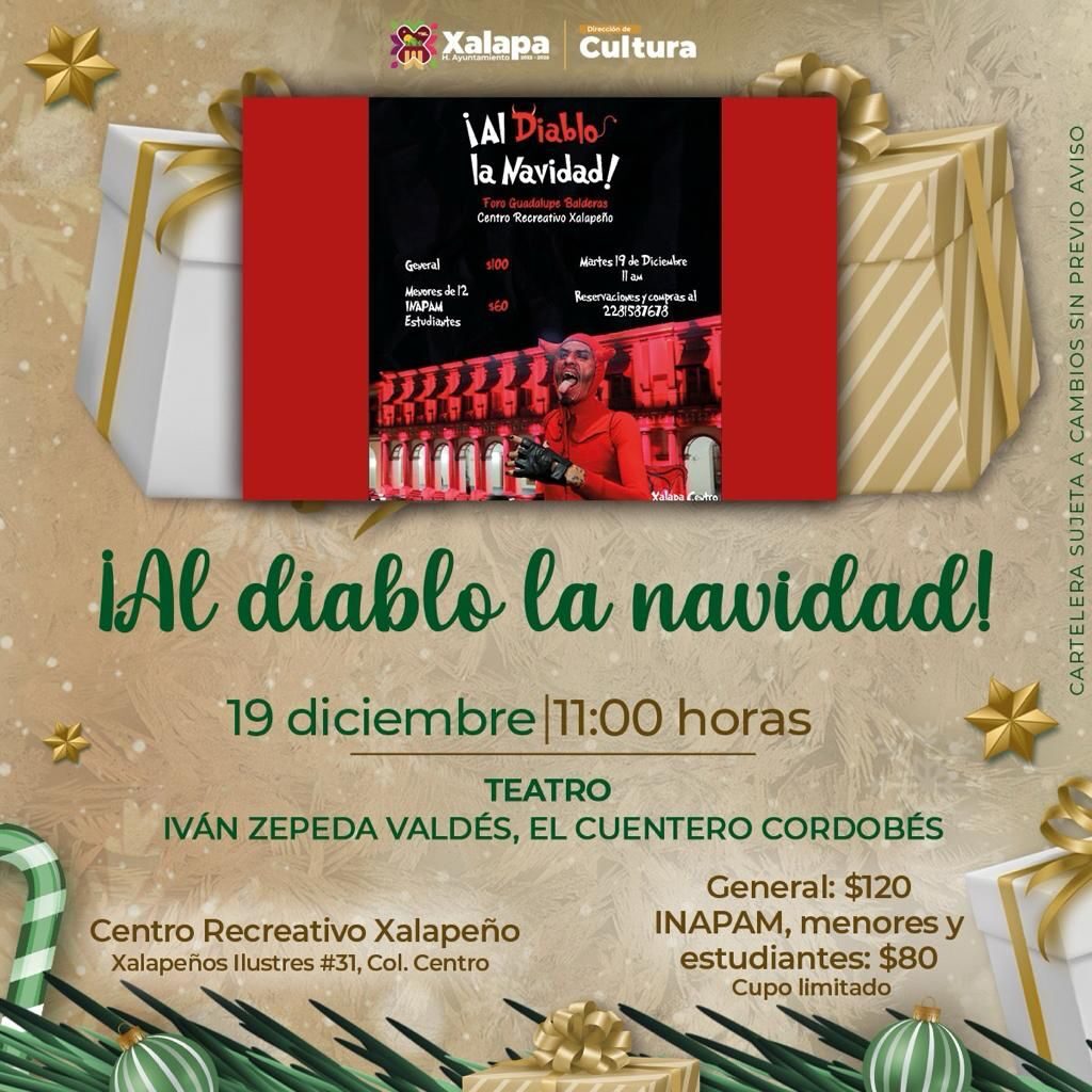 Además, este lunes 18 de diciembre a las 18:00 horas, en el Teatro J.J. Herrera, Bioskop & Marea Audiovisual presentarán una muestra cinematográfica, y el martes 19 de diciembre a las 11:00 horas, en este mismo recinto, Caras Viajantes Teatro presentará la obra “¡Fuchi, guácala!, al diablo macho”; mientras que a la misma hora, pero en el Centro Recreativo Xalapeño (CRX), Iván Zepeda Valdés, “El cuentero cordobés”, entretendrá a los asistentes con “¡Al diablo la Navidad!”.
