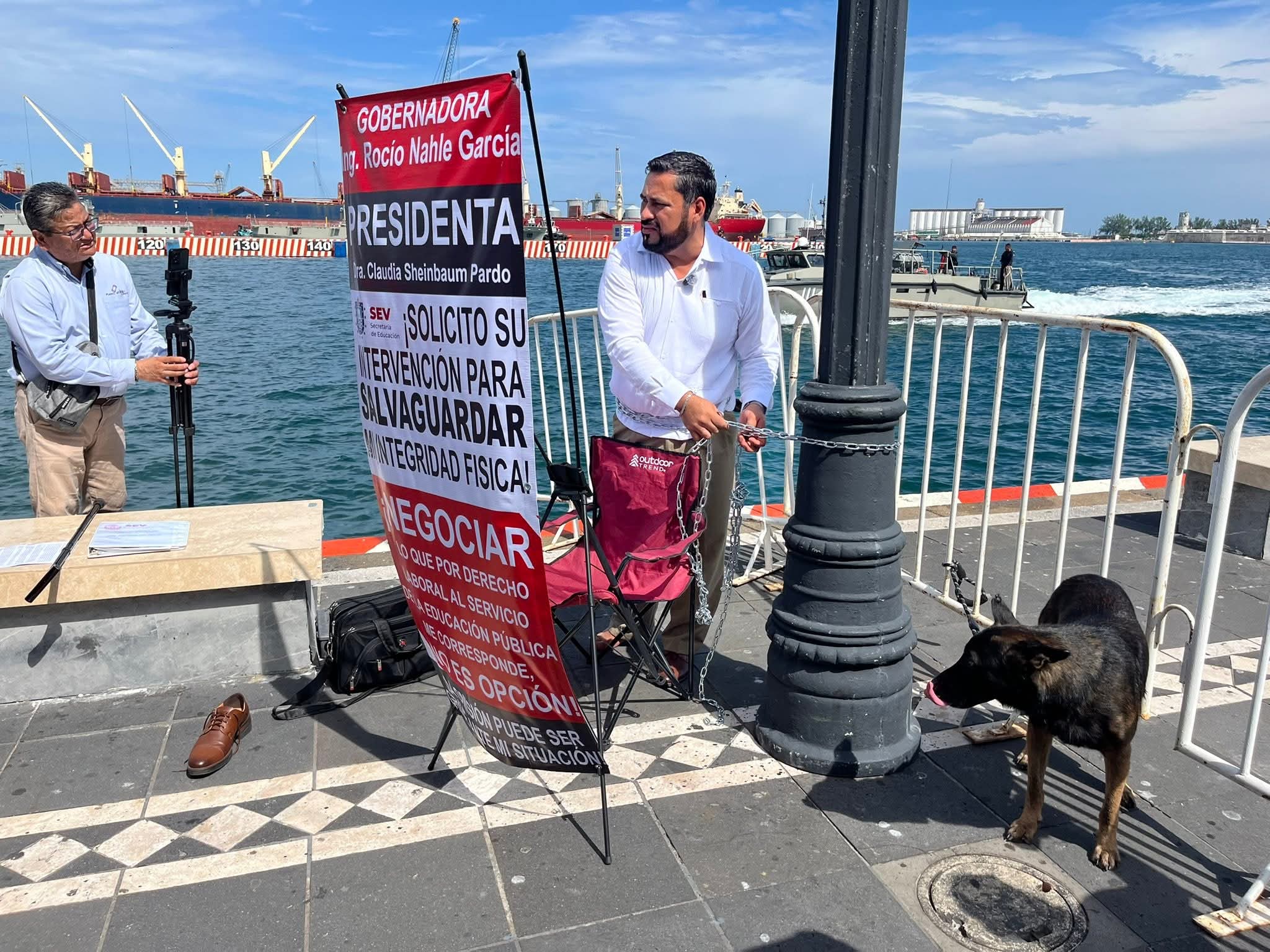 El docente anunció que se mantendrá encadenado y en huelga de hambre en la Macroplaza hasta que las autoridades cumplan con la entrega del seguro. Aseguró que su protesta no busca únicamente beneficio personal, sino también poner sobre la mesa las carencias e injusticias que atraviesan otros trabajadores del magisterio veracruzano.