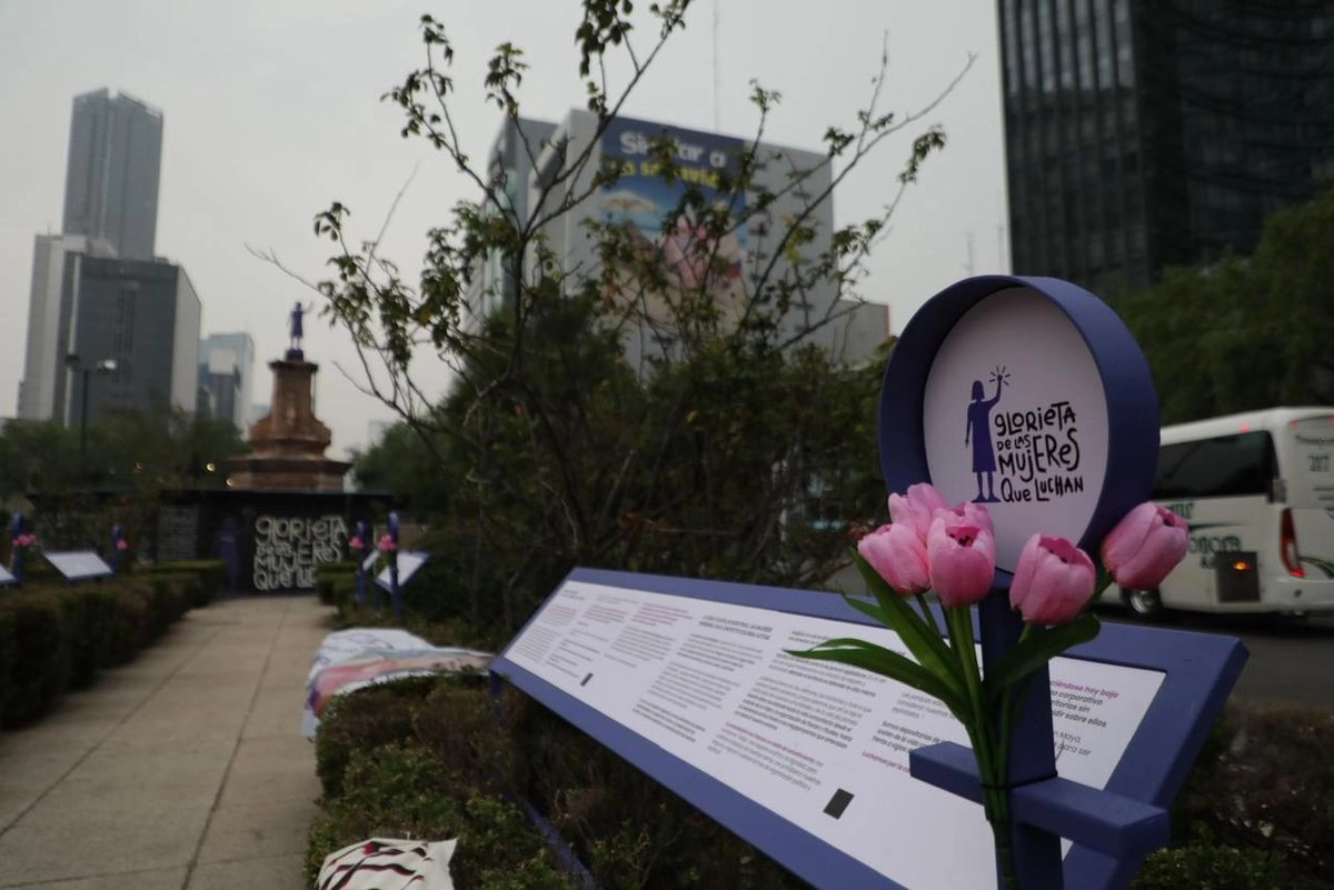 Integrantes de diversas colectivas se manifestaron en la Glorieta de las Mujeres que Luchan en Paseo de la Reforma para conmemorar el cuarto aniversario de la toma de este espacio público.