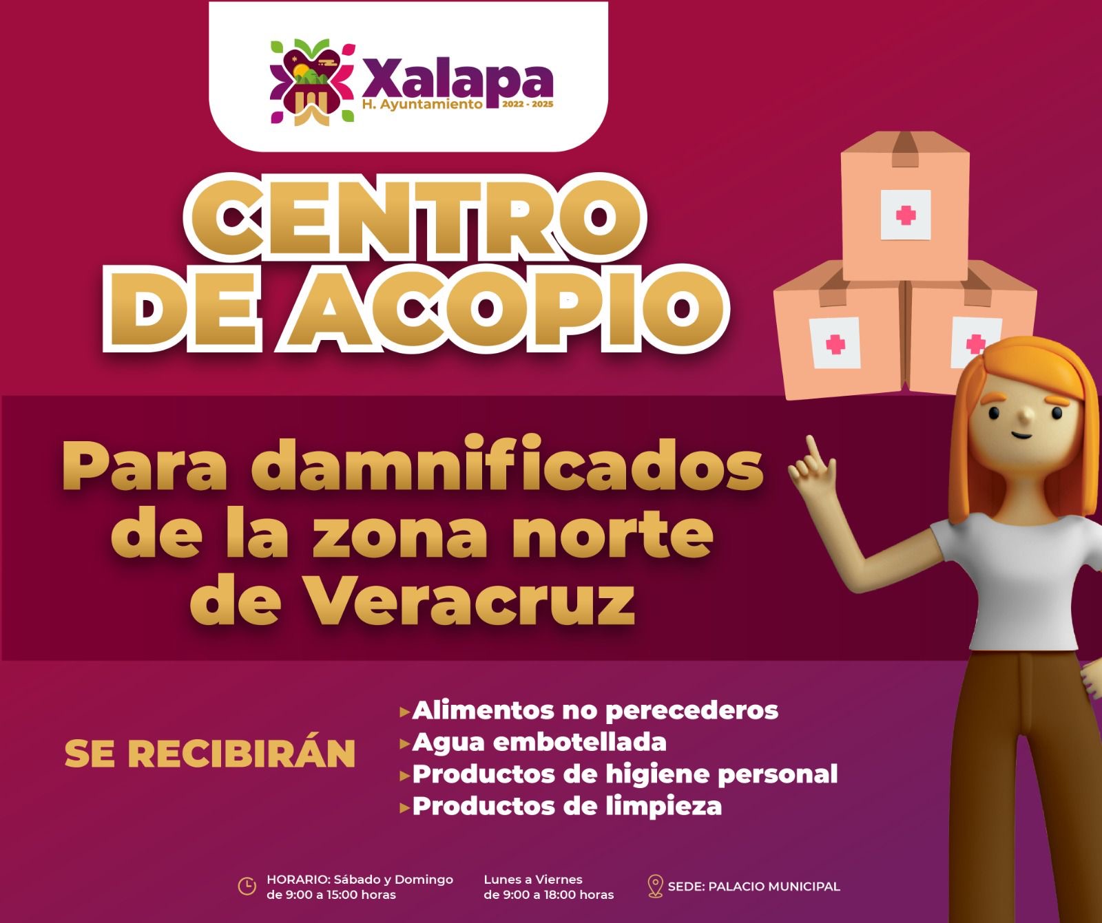 Xalapa, Ver.- El Ayuntamiento de Xalapa invita a la ciudadanía y a todos los sectores sociales y productivos de la ciudad a solidarizarse con las familias de la zona norte de Veracruz que resultaron afectadas por las lluvias, donando alimentos no perecederos, artículos de limpieza y de aseo personal en el Centro de Acopio que se instalará a partir de este sábado en el patio central de Palacio Municipal.