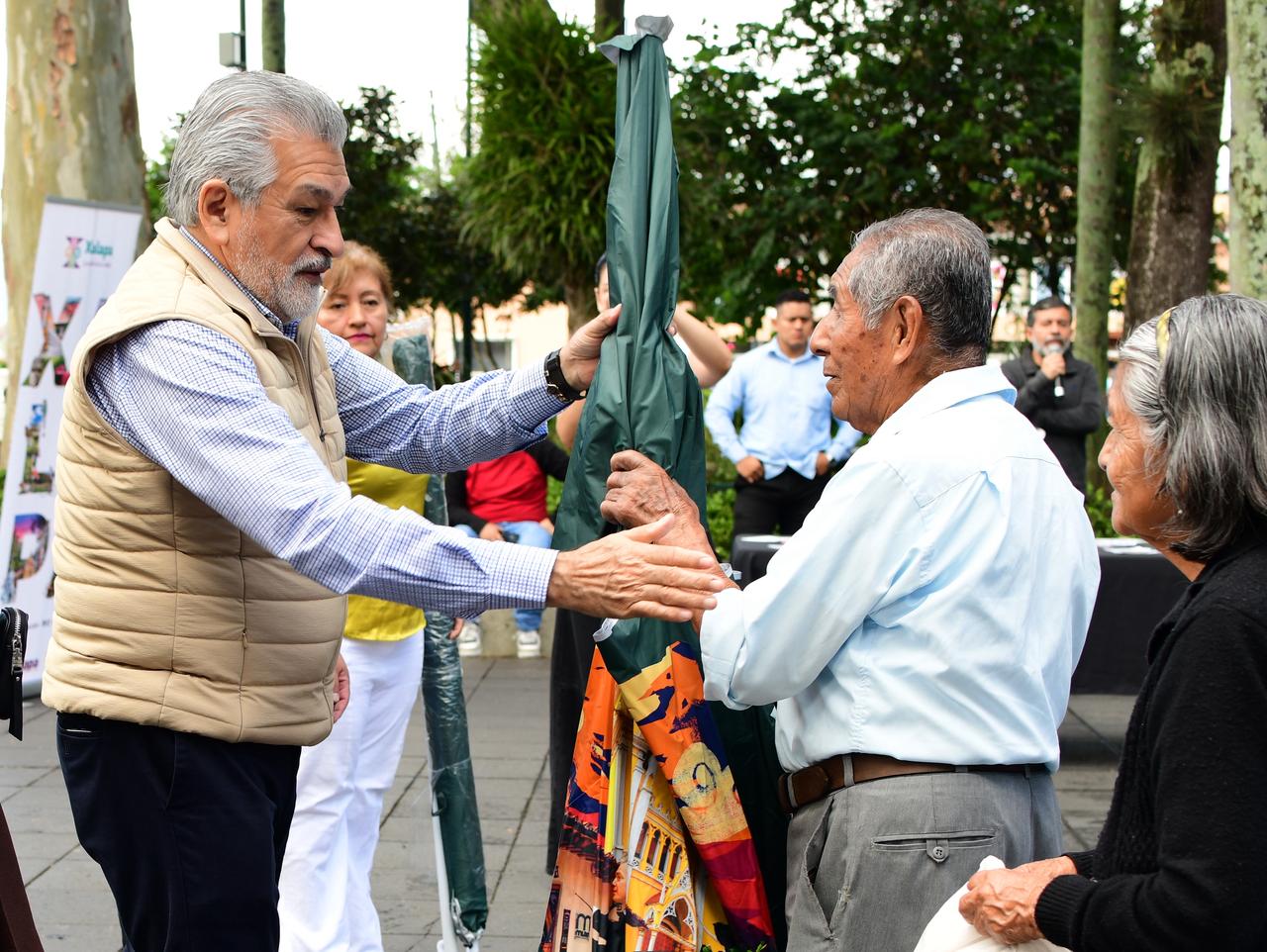 Xalapa, Ver.- Con el propósito de fortalecer la identidad turística de Xalapa y homogeneizar la imagen comercial del parque Benito Juárez, el alcalde Alberto Islas Reyes entregó sombrillas con imágenes turísticas a vendedores de este espacio emblemático de la ciudad.