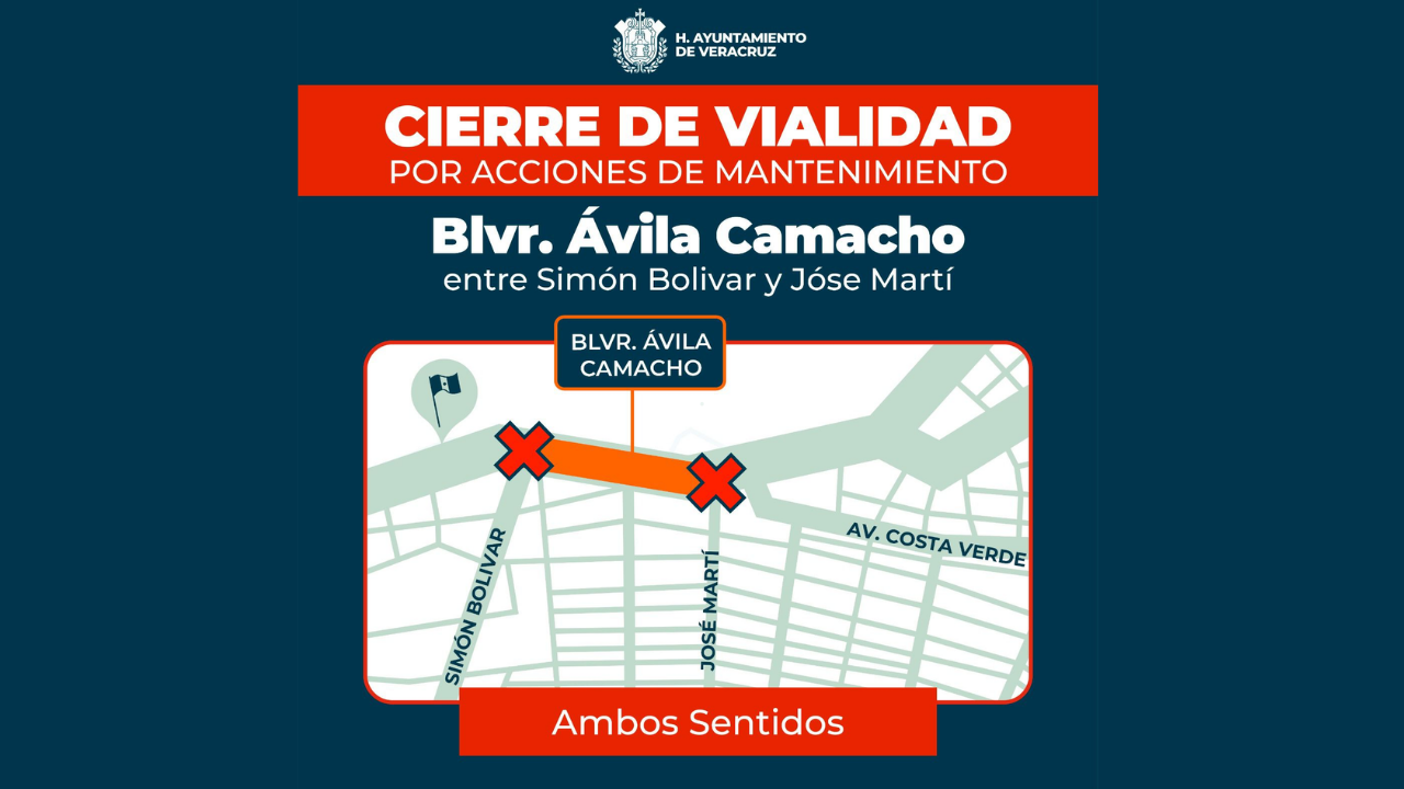 El Ayuntamiento de Veracruz informa a la ciudadanía que, a partir de hoy, debido a labores de mantenimiento, permanecerá cerrado el Bulevar Manuel Ávila Camacho, en el tramo comprendido de Simón Bolívar a Martí, en ambos sentidos de circulación.