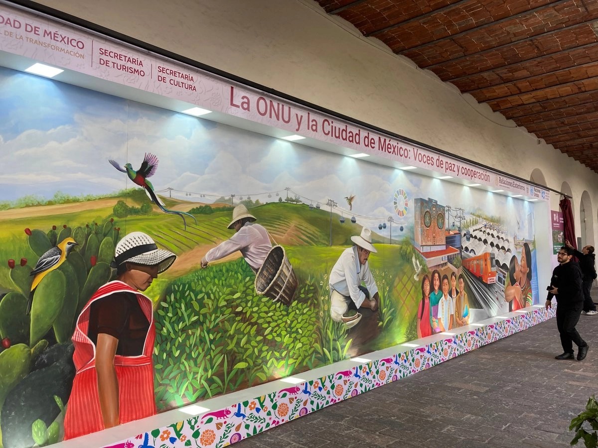 Artistas del proyecto Ciudad Mural, de la Secretaría de Cultura de del gobierno capitalino, plasmaron la colaboración de la Organización de las Naciones Unidas (ONU), a través de sus distintas agencias en México, con la capital del país en una obra instalada en el Antiguo Colegio de la Santa Cruz, en Tlatelolco.