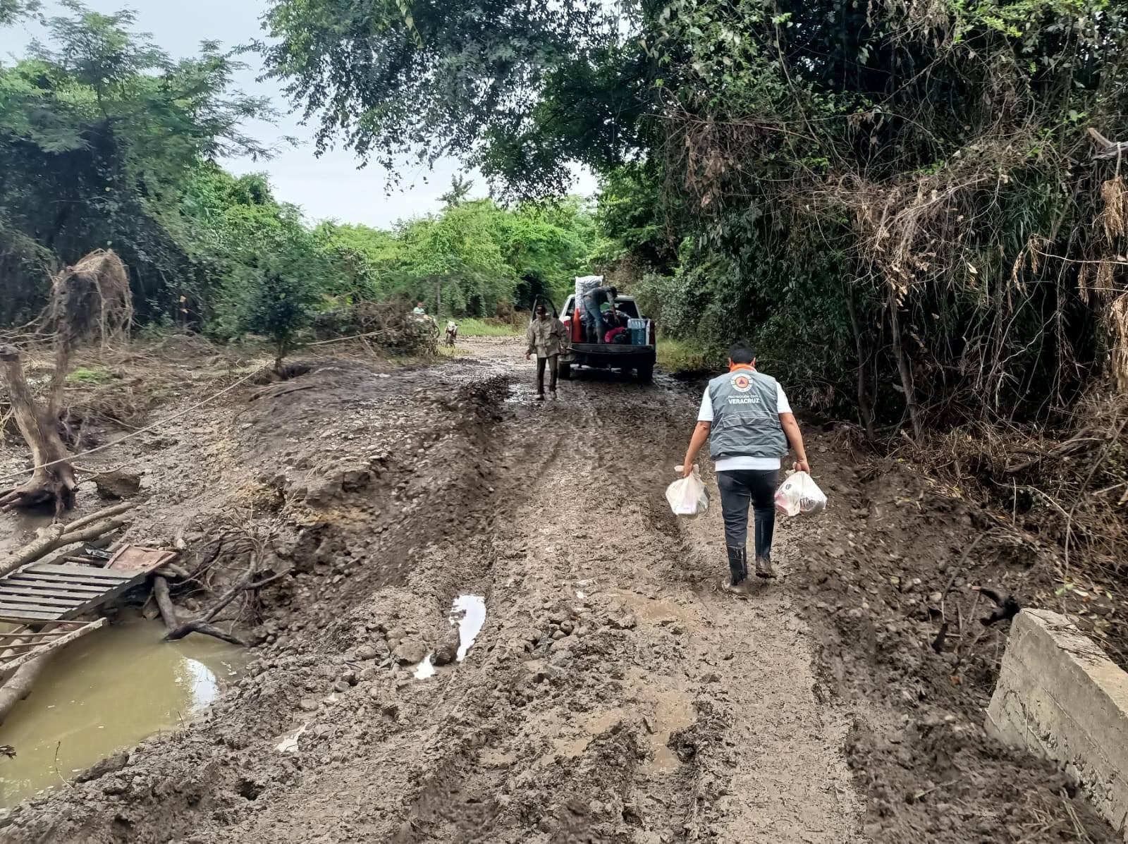 La dependencia también colabora con personal de la Secretaría de Marina en tareas de limpieza y retiro de escombros en la localidad de Chahuatlán, perteneciente a Ilamatlán, donde los caminos siguen obstruidos por los efectos de los deslaves.