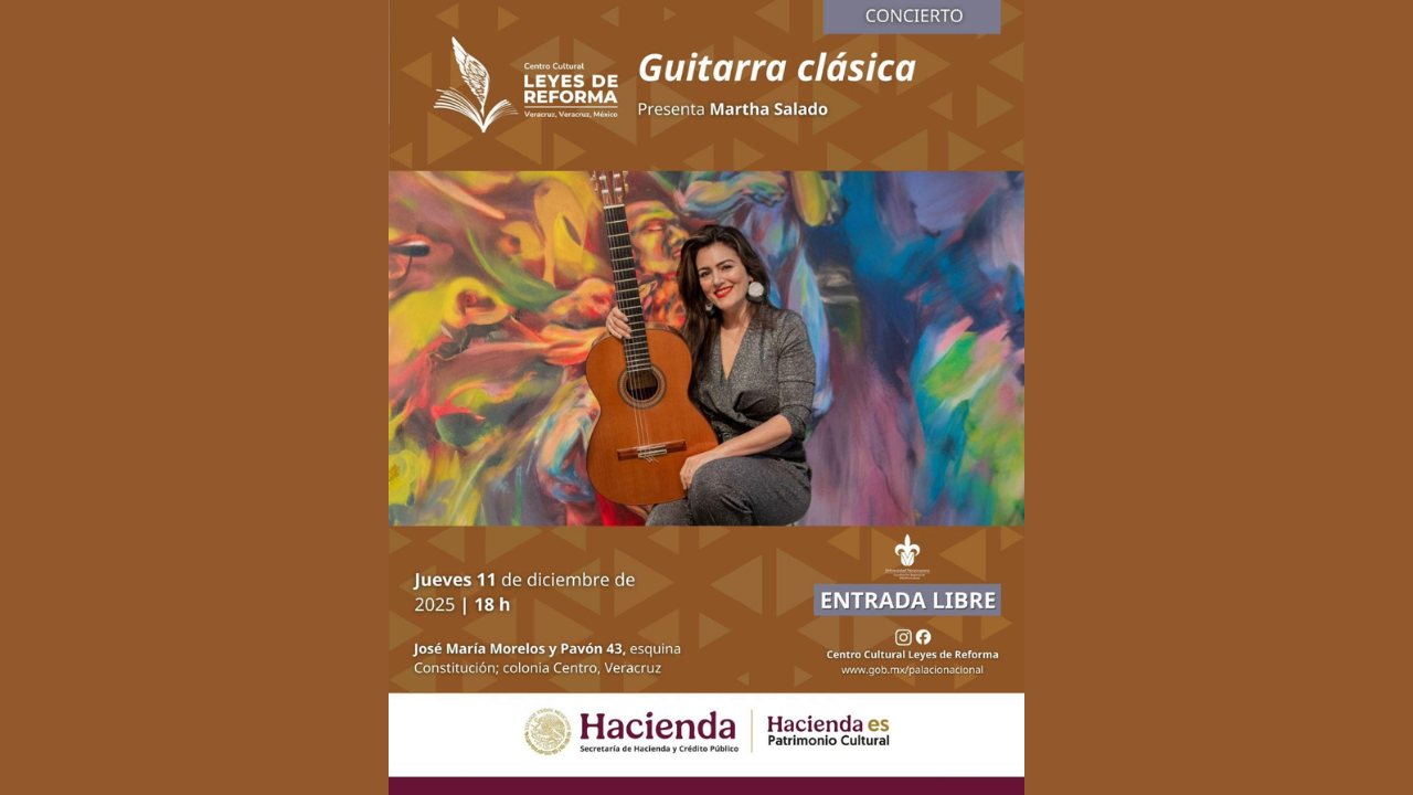El Centro Cultural Leyes de Reforma (CCLR), recinto de la Dirección General de la Conservaduría de Palacio Nacional y Patrimonio Cultural de la Secretaría de Hacienda y Crédito Público (SHCP), en colaboración con la coordinación de Difusión Cultural región Veracruz de la Universidad Veracruzana (UV), invita al concierto didáctico de guitarra clásica que ofrecerá la intérprete Martha Salado, el jueves 11 de diciembre a las 18:00 horas.