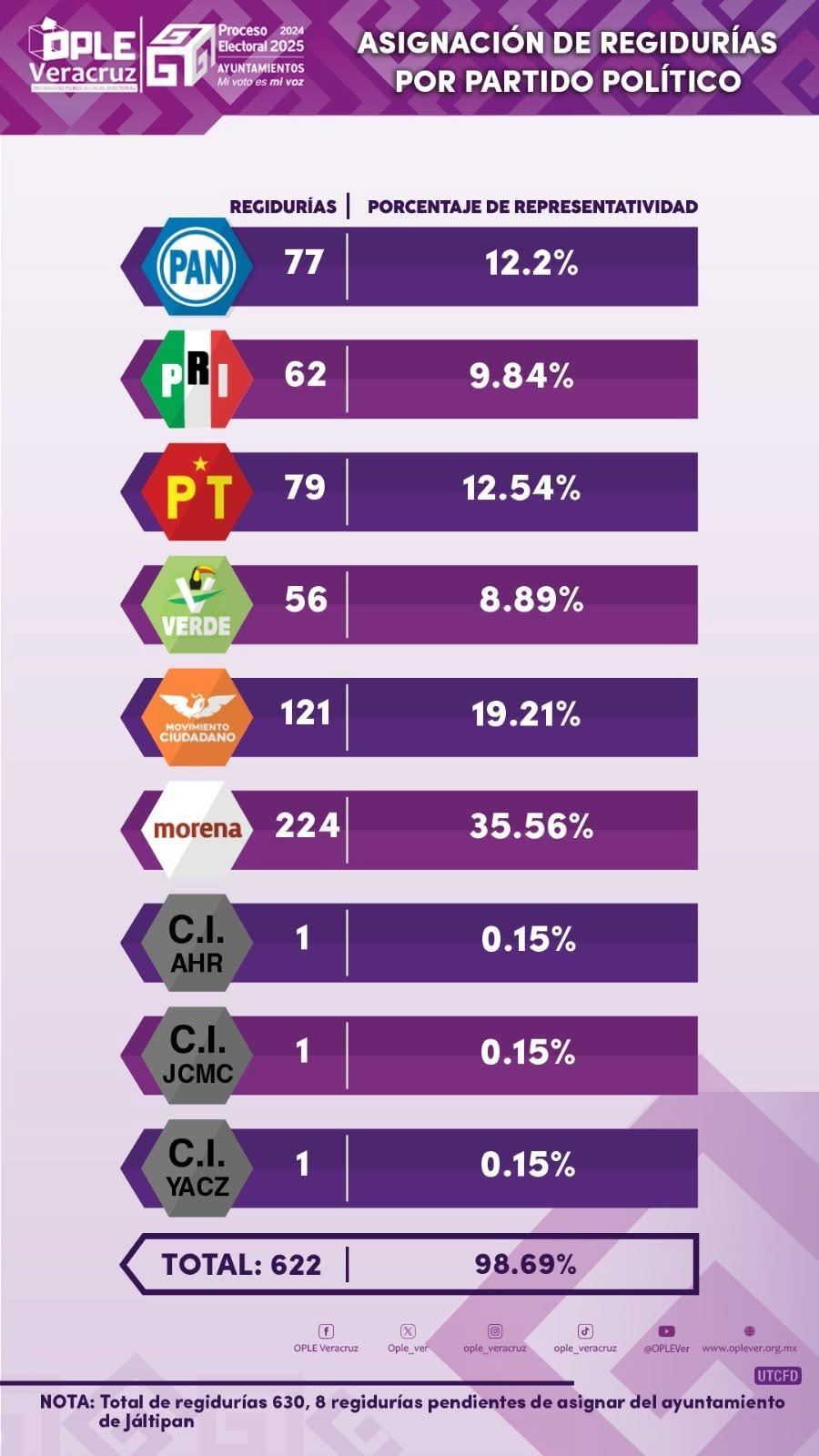 Ya que los números de como quedaron el total de las regidurías en Veracruz, fue de la siguiente manera.. MORENA tuvo 224, que representa el 35.56 por ciento; Movimiento Ciudadano logró 121, que es el 19.21 por ciento; Partido del Trabajo obtuvo 79, que es el 12.54 por ciento.. Mientras que el PAN logró 77, que son el 12.2 por ciento.. El PRI tiene 62, que es el 9.84 por ciento.. El PVEM logró 56, que es el 8.89 por ciento.. Y el resto de las 3 regidurías fueron para candidatos independientes, que es el 0.15 por ciento.. Dando un total de 622 cargos edilicios, que es el 98.69 por ciento.. Pero la “LECTURA” de todo esto.. Es la siguiente..
