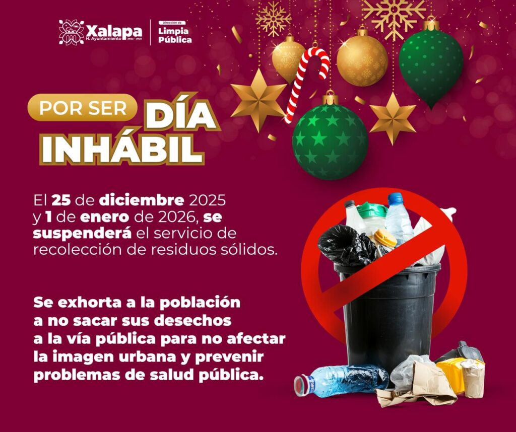 Xalapa, Ver.- El Ayuntamiento de Xalapa, a través de la Dirección de Limpia Pública, informa a la ciudadanía que por ser días inhábiles, el próximo 25 de diciembre y 1 de enero se suspenderá el servicio de recolección de residuos sólidos.