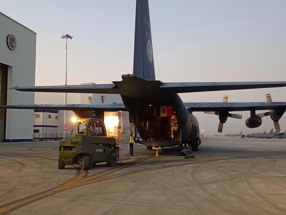 Este viernes pasadas las 9 de la mañana partió la aeronave de la Fuerza Aérea Mexicana, un Hércules 3616 perteneciente al Escuadrón 302, que despegó de la Base Aérea Militar número 1, en Santa Lucía, Estado de México.