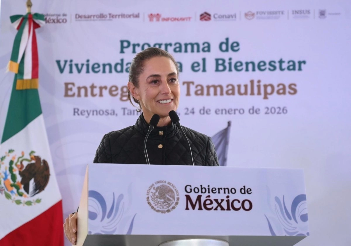 Sheinbaum Pardo acudió este sábado a la Unidad Habitacional Florencia en la periferia de Reynosa, y en la que hoy se entregaron los primeros departamentos, así como otros apoyos del programa Viviendas para el Bienestar por medio de distintas dependencias federales.