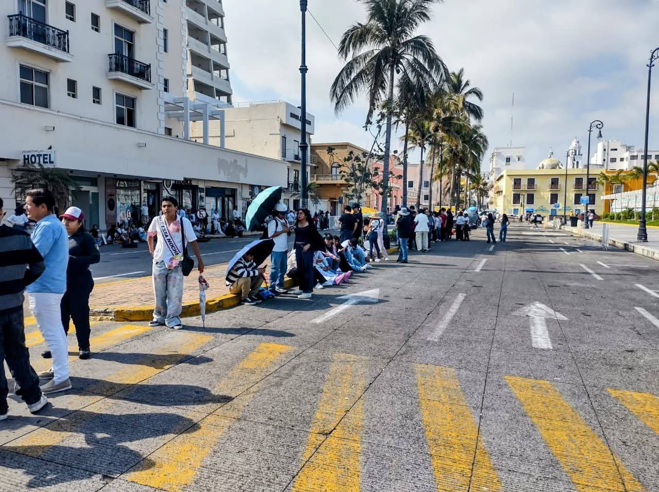 Seguidores de Mon Laferte permanecen formados desde la madrugada en la Macroplaza del Malecón para asegurar un lugar en el concierto masivo que la artista ofrecerá esta noche como parte del Carnaval de Veracruz 2026.