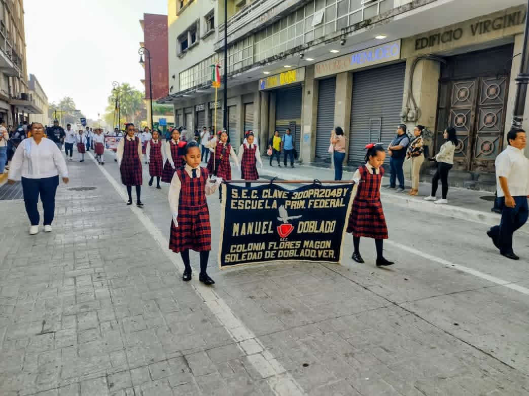 En el contingente participaron alrededor de 600 alumnos provenientes de los municipios de Veracruz, Boca del Río, Medellín, Soledad de Doblado, Camarón de Tejeda y Paso de Ovejas, quienes recorrieron la principal arteria del centro acompañados por bandas de guerra, docentes y padres de familia.